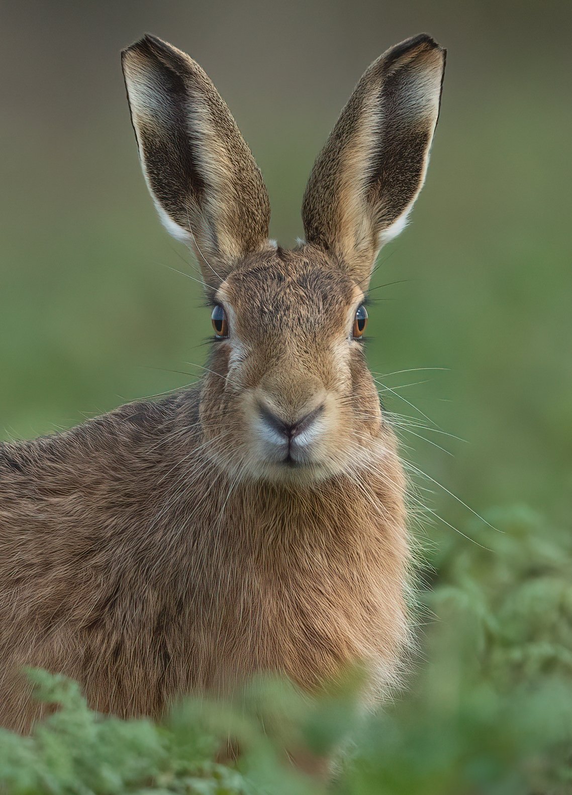 Close-up wildlife photograph of a brown hare with upright ears, captured in soft natural light against a smooth green background