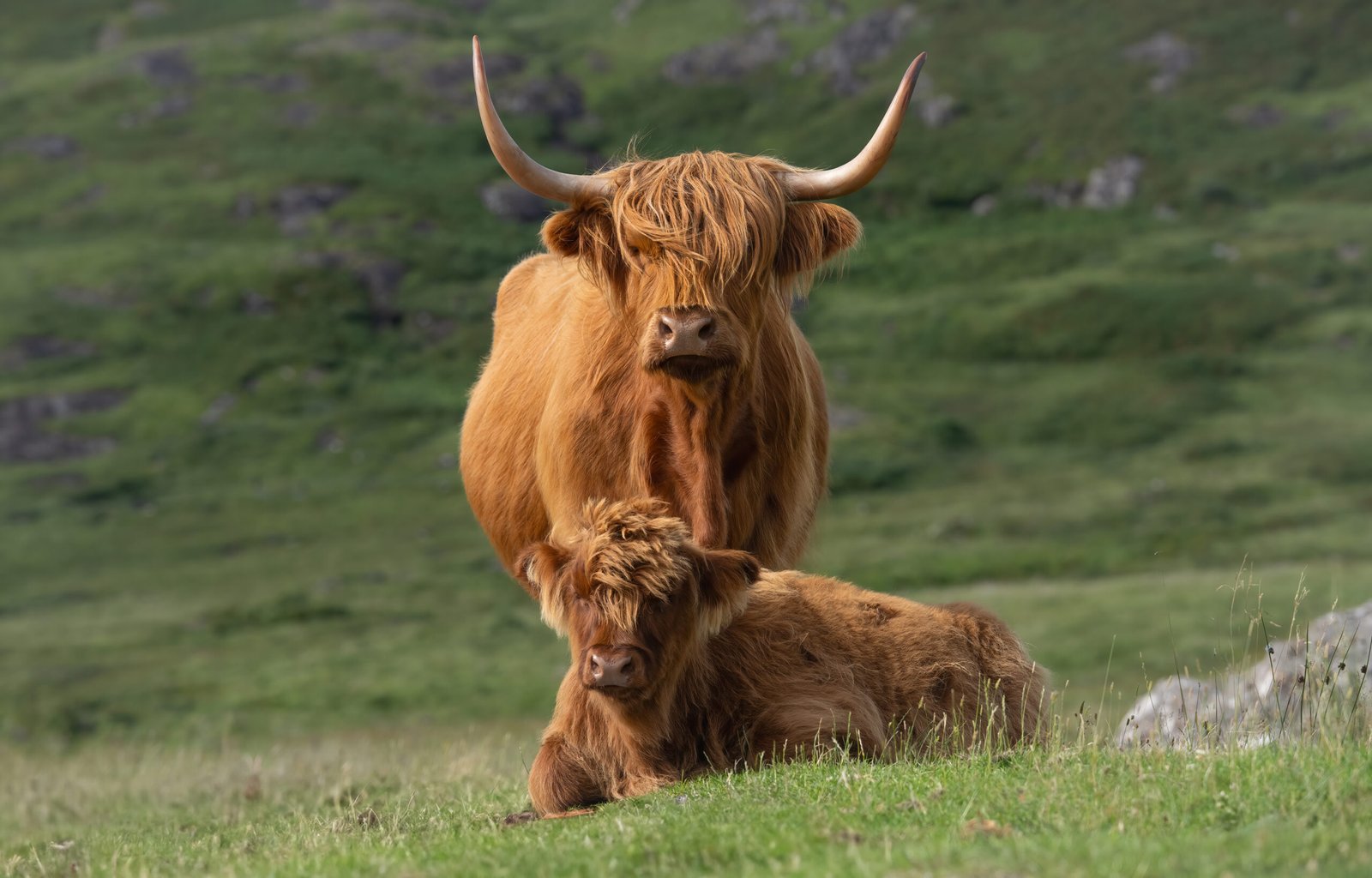 A majestic Highland cows. Mother & Calf stand peacefully on a tranquil hill side a vast, clear blue sky. Experience the rugged beauty of Scotland’s iconic ‘Heilan Coo