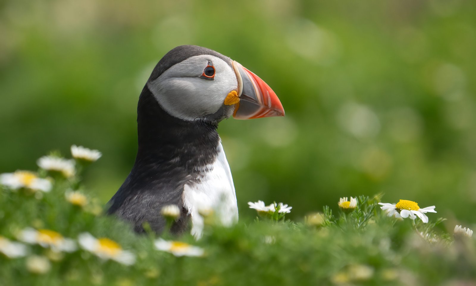 Puffin in the daisies