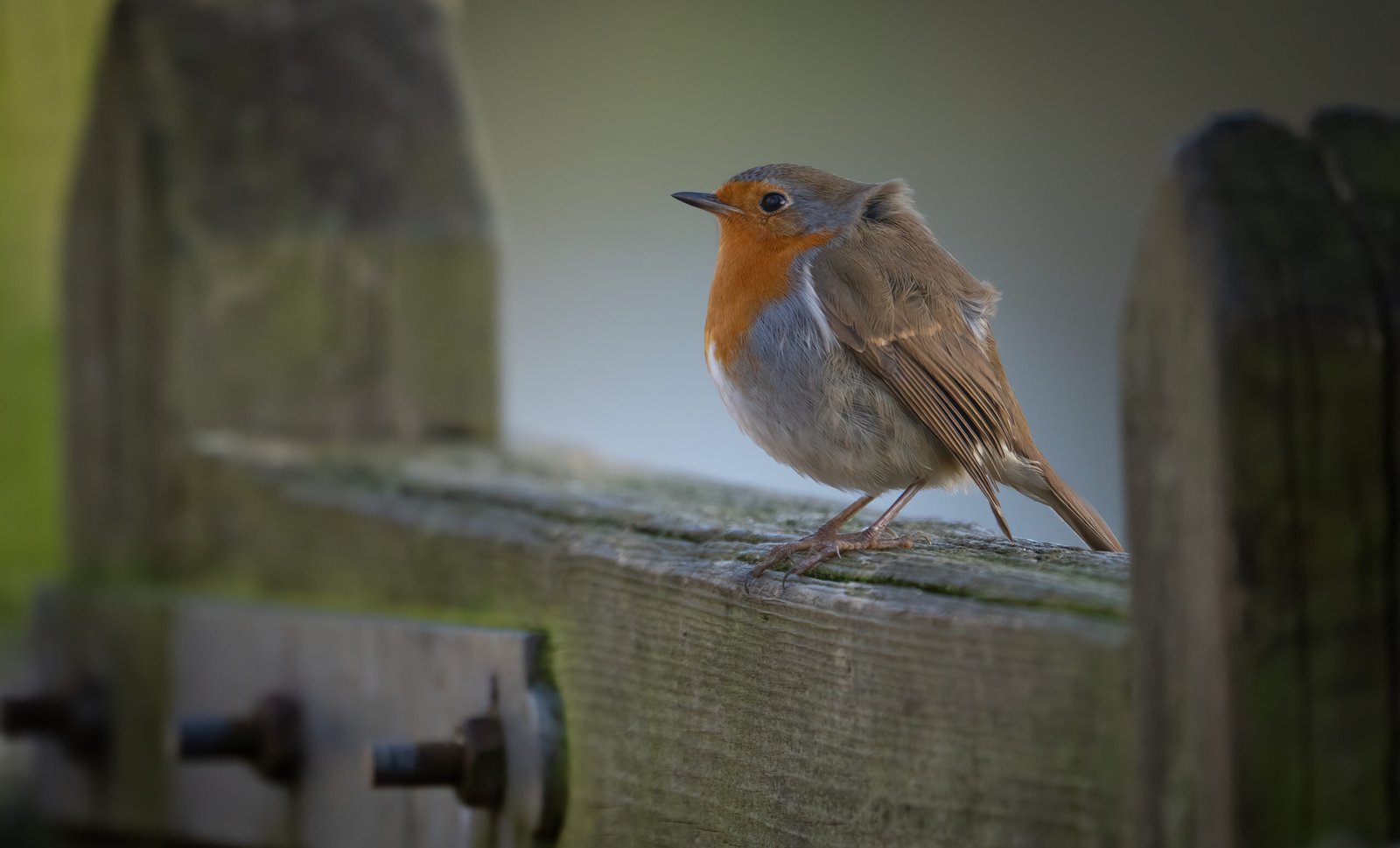 A resilient robin stands atop a rustic wooden gate as the wind ruffles its feathers. Experience the raw, breezy beauty of this garden favourite