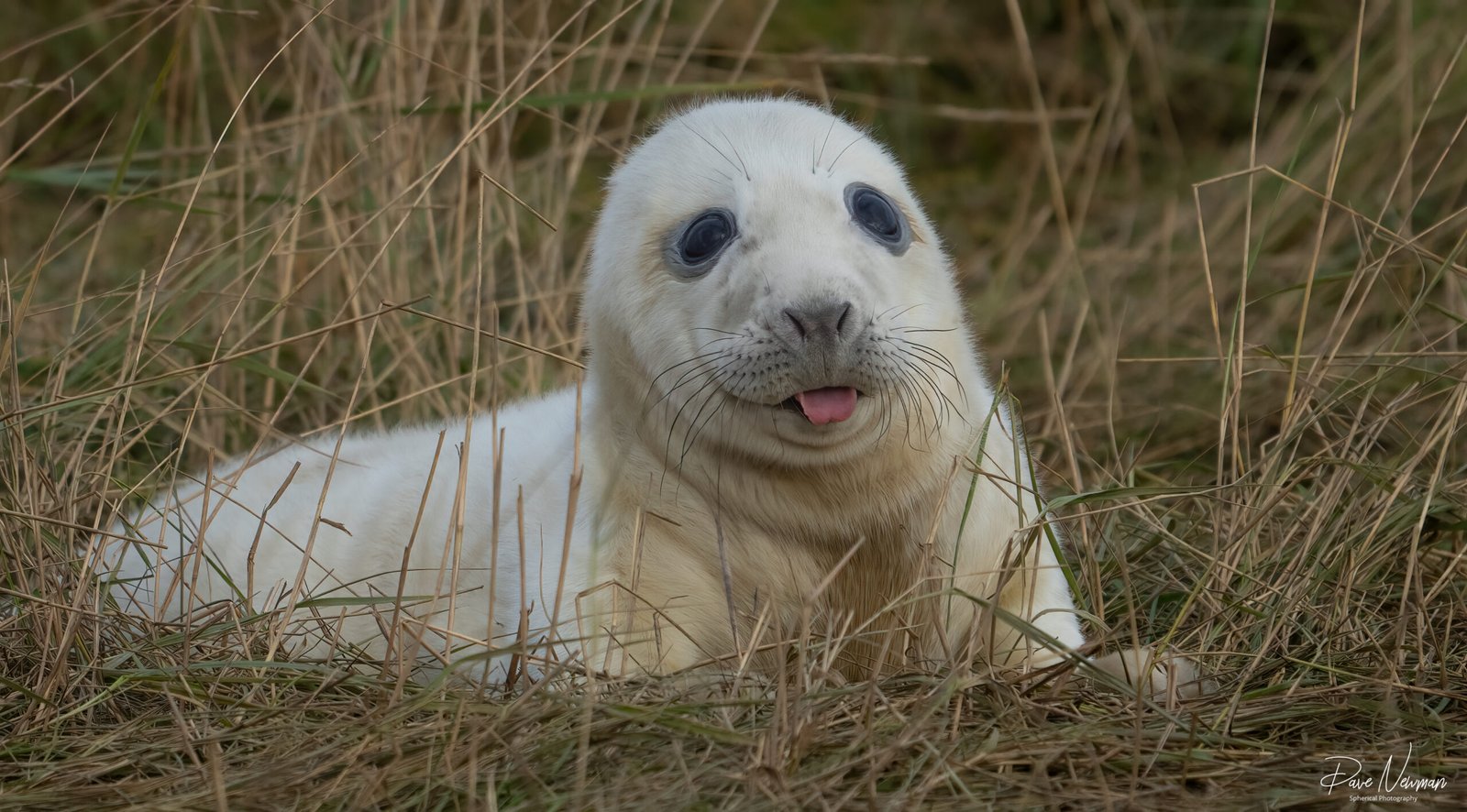 Days old Young Seal Pup being very cheeky and ticking out its tongue while it poses for a picture amongst the sand dune grasses.
