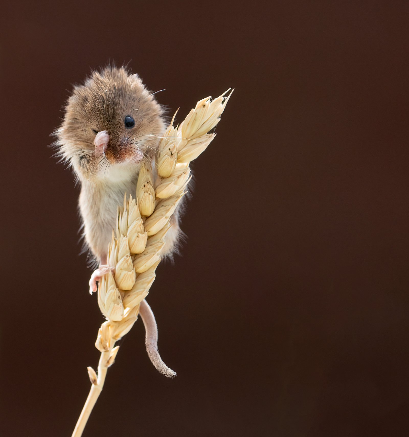 Witness the quiet beauty of a shy harvest mouse balancing delicately on a golden ear of corn. A perfect moment of nature’s smallest wonders