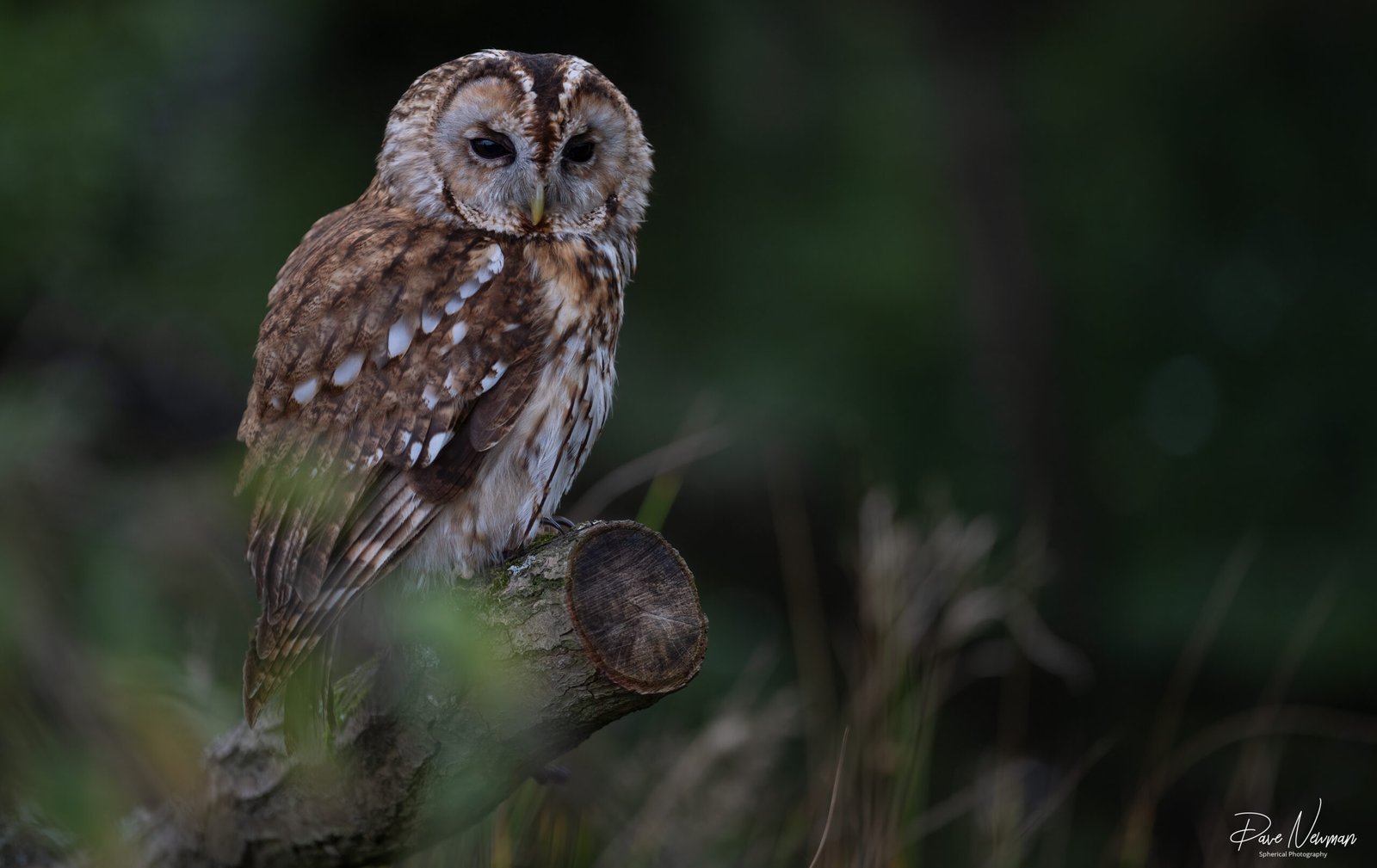 A stunning tawny owl perched on a mossy log, its mottled brown feathers providing perfect camouflage. See the detail of its large dark eyes.
